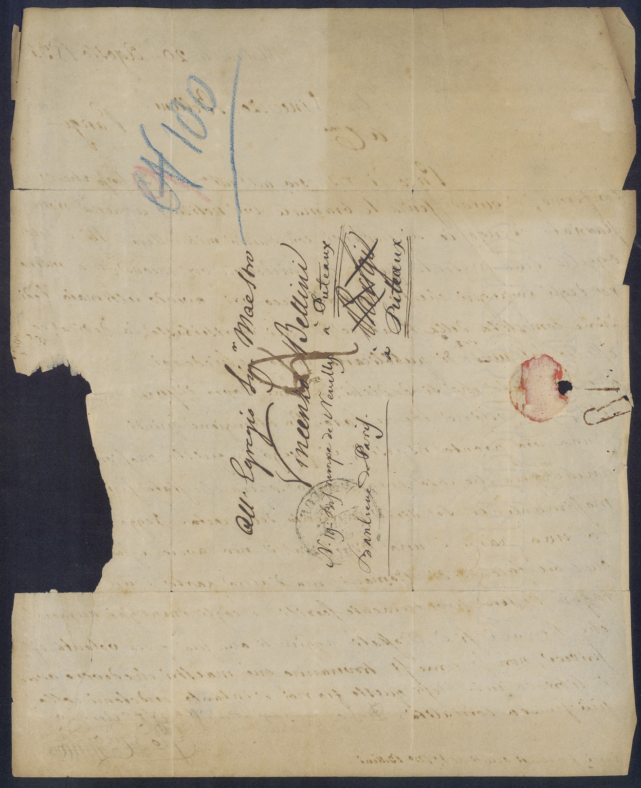 Privo di risposta all’ult‹im›a mia 31 scorso che vi confermo, e quindi senza le bramate v‹ost›re notizie, appena rimpatriato vengo io a trovarvi con questa mia lettera. Né è solo oggetto della presente quello di chiedervi v‹ost›re nuove; ma memore degli impegni che ho contratti seco voi, avendo ultimata l’edizione completa della Beatrice, di cui vi riserbaste la dedica, ed essendo sul punto di pubblicarla, vengo a chiedervi a chi volete che si dedichi, e come dovrò disporre delle copie veline che ne farò. In attenzione quindi di una v‹ost›ra pronta risposta, vi prego in questa occasion‹e di dirmi› anche qualche cosa della nuova opera che state scriv‹endo e› massimamente se siete contento del poeta. Veggo ‹anch’io che› da una parte è una disgrazia il non avere a sua ‹disposizione› quel bel talento di Romani, ma d’altra parte è un ‹gran van›taggio l’essere prontamente serviti, e cogli impegni numerosi che Romani si è addossati aggiunti alla sua poca volontà di scrivere, non so come si troveranno que’ maestri che devono avere i libri da lui. Resti questo fra noi, e intanto credetemi colla più sincera cordialità